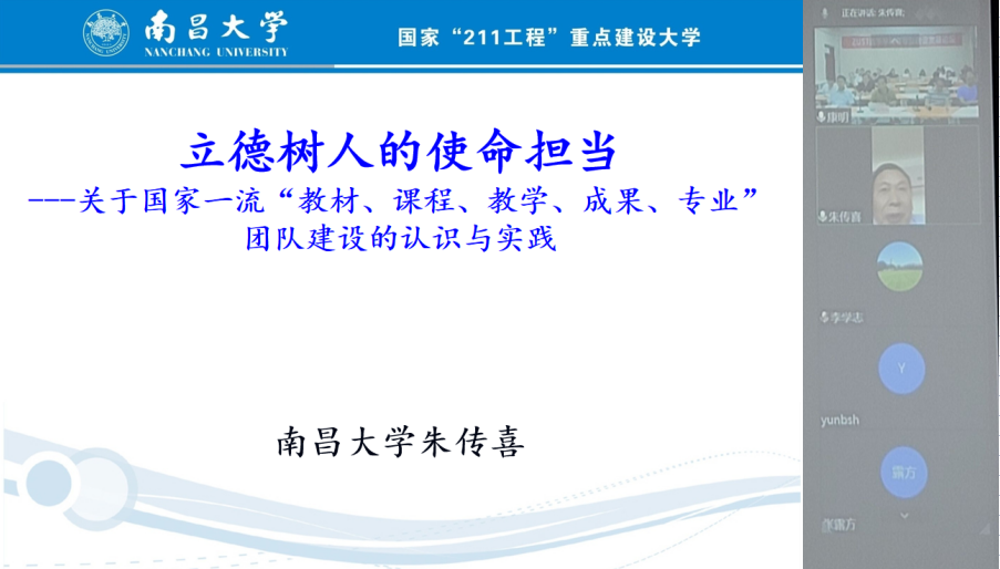 9月25日,理学院在闻理园A4-116召开“数学学科与专业建设研讨会”,在下午会议的专题报告环节,国家级教学名师、国家一流专业负责人、国家级教学成果获得者、南昌大学朱传喜教授应邀做了“立德树人的使命担当---关于国家一流‘教材、课程、教学、成果、专业’团队建设的认识与实践”的线上专题教学论坛。报告由校党委委员、学院院长陶祥兴教授主持。