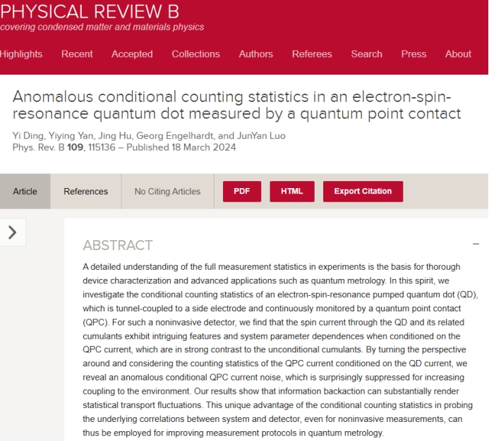 近日,我院与罗马尼亚巴比什-博雅依大学联合培养博士研究生丁一同学以第一作者在国际权威物理学术期刊《Physical Review B》上发表了题为"Anomalous conditional counting statistics in an electron-spin-resonance quantum dot measured by a quantum point contact”的研究论文,物理系骆钧炎教授为论文通讯作者,颜益营副教授、南方科技大学Georg Engelhardt副研究员为共同指导教师。《Physical Review B》是由美国物理学会(American Physical Society)主办的学术期刊之一,影响因子3.908,中科院二区TOP期刊,是凝聚态物理方面最有影响力和最权威的期刊之一,也是自然指数(Nature Index)收录的全球82个顶级期刊之一。