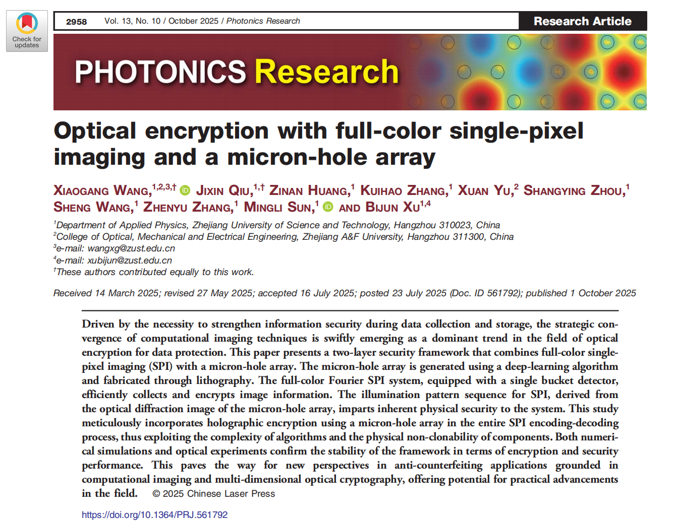 近日,理学院光子与光场调控研究团队在光信息安全处理研究领域取得重要进展,相关研究成果以“Optical Encryption with Full-Color Single-Pixel Imaging and Micron-Hole Array”为题,发表于光学领域顶级期刊《Photonics Research》(影响因子7.2,中科院一区Top)。汪小刚教授、物理系2023级硕士研究生邱基鑫为本文的共同第一作者,汪小刚教授、徐弼军教授为论文的共同通讯作者。