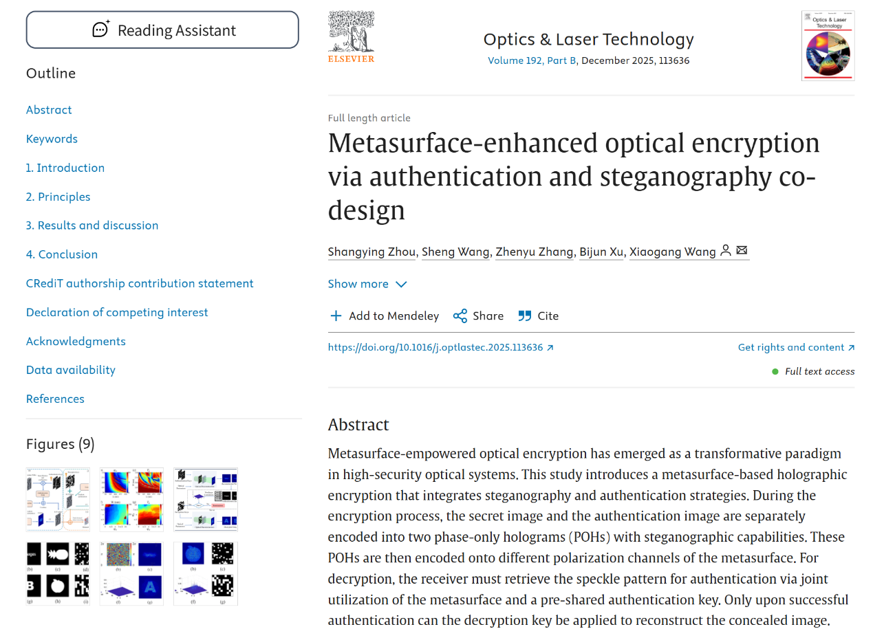 近日,应用物理系2022级研究生周尚营,以第一作者身份在《Optics and Laser Technology》(影响因子5.0,中科院二区Top)上发表论文,题目为“Metasurface-enhanced optical encryption via authentication and steganography co-design”。该研究提出基于认证与隐写术协同设计的超表面增强光学加密方案。该方案以梯度下降算法将秘密图像和认证图像编码成带隐写功能的纯相位全息图,载入超表面不同偏振通道。为提升超表面信息容量、构建分级安全屏障防未授权解密提供了新思路。
