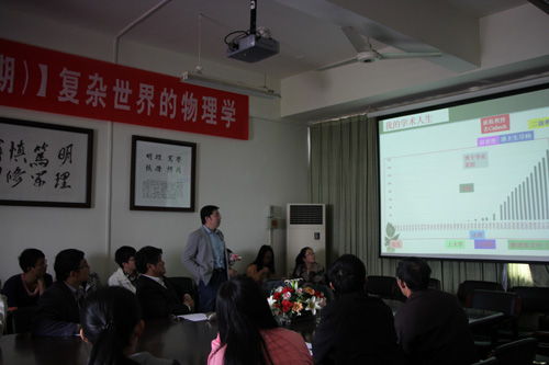 近日,北京师范大学郑志刚教授应邀来我院作了“复杂世界的物理学”的学术报告。报告由应用物理系系主任潘卫清博士主持,理学院院长岑岗教授、院长助理骆均炎博士、物理系副主任王建中老师以及物理系教师和部分高年级学生参加了讲座。
